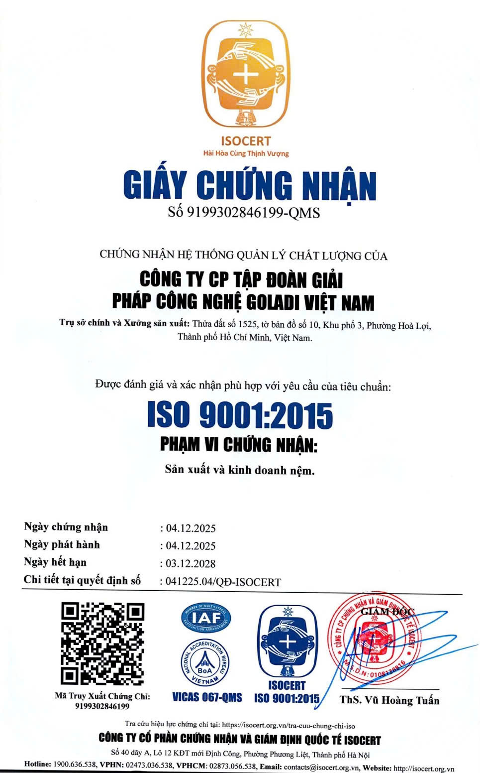 “Goladi Việt Nam được chứng nhận ISO 9001:2015 về Hệ thống Quản lý Chất lượng trong sản xuất và kinh doanh nệm bởi **ISOCERT – tổ chức chứng nhận quốc tế.”